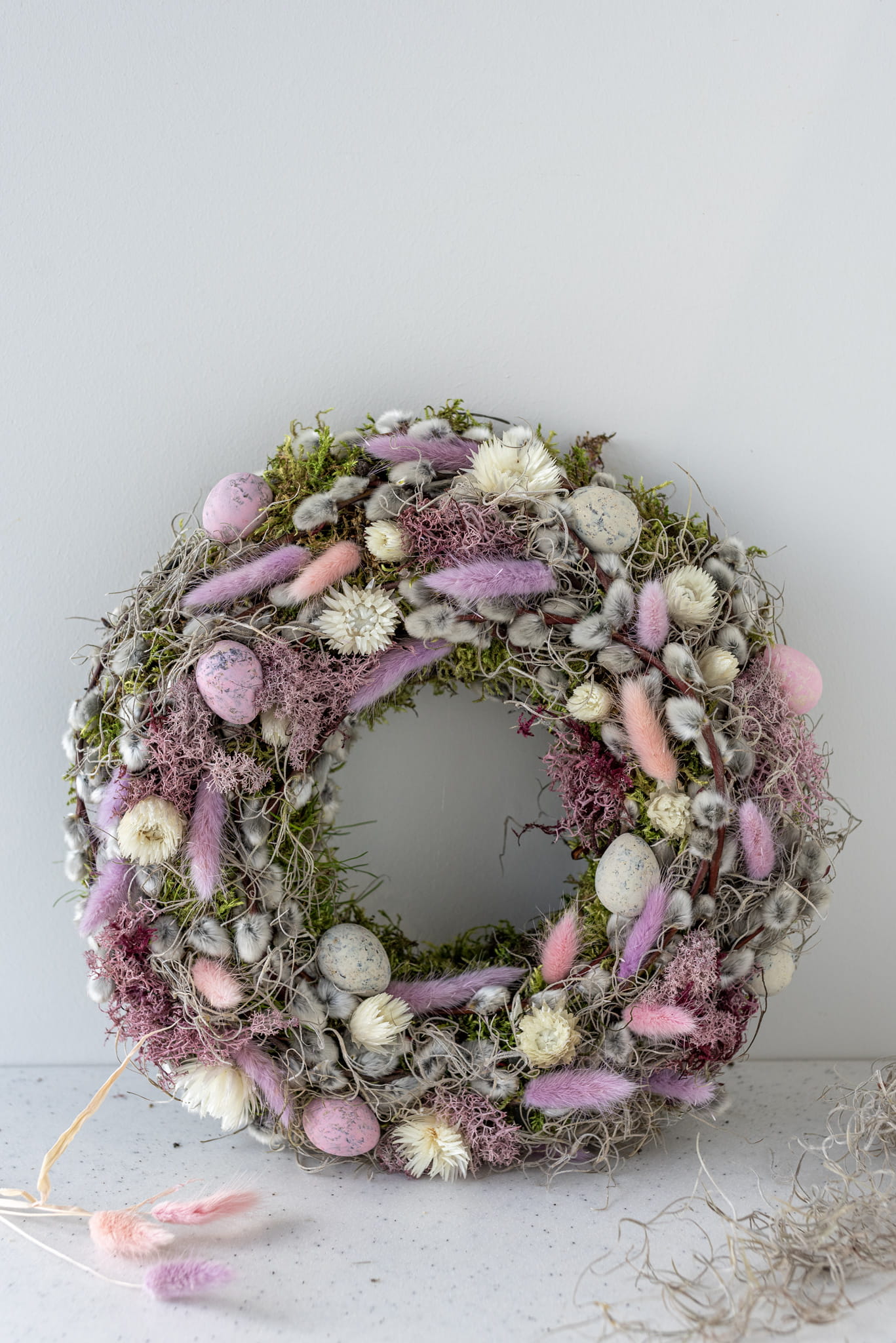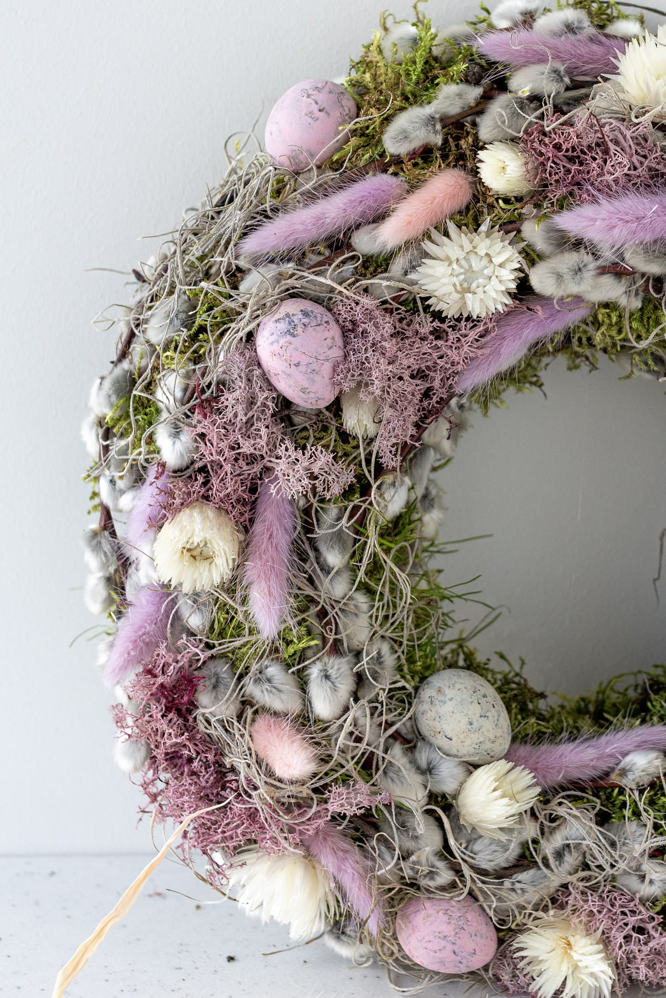 Wianek wielkanocny na mchu i tillandsii. Udekorowany naturalnymi wydmuszkami jaj przepiórczych w odcieniach koloru różowego, gałązkami wierzby,chrobotkiem oraz dmuszkiem w pastelowych odcieniach różu i fioletu.