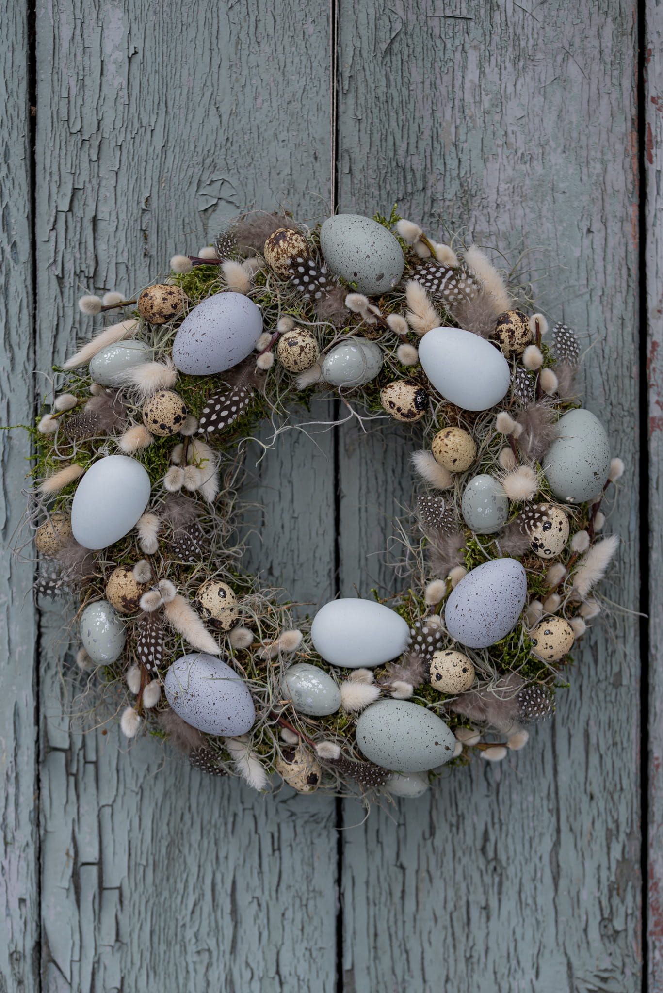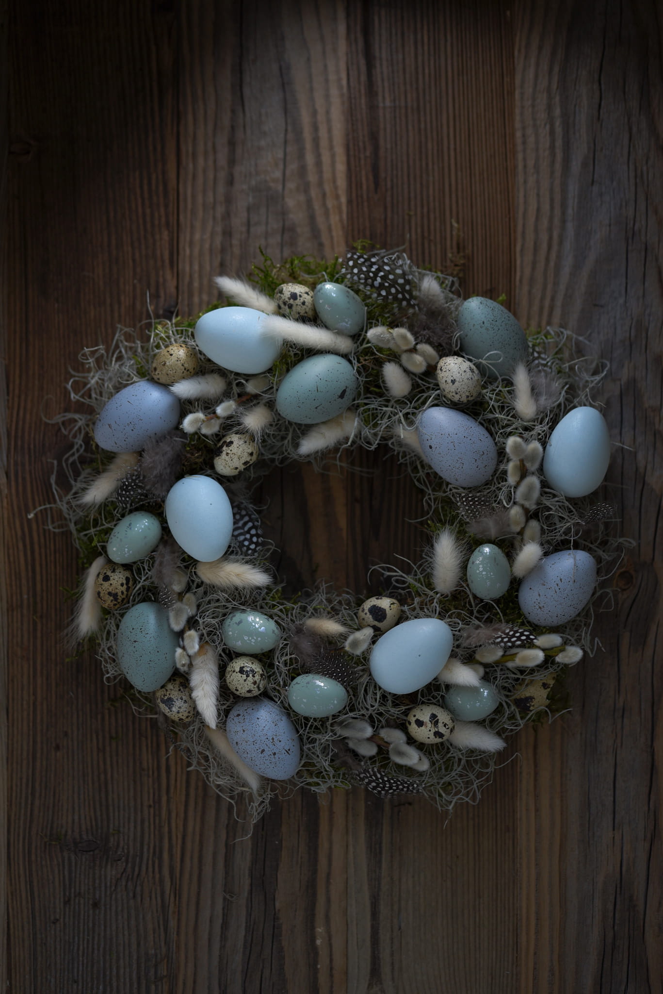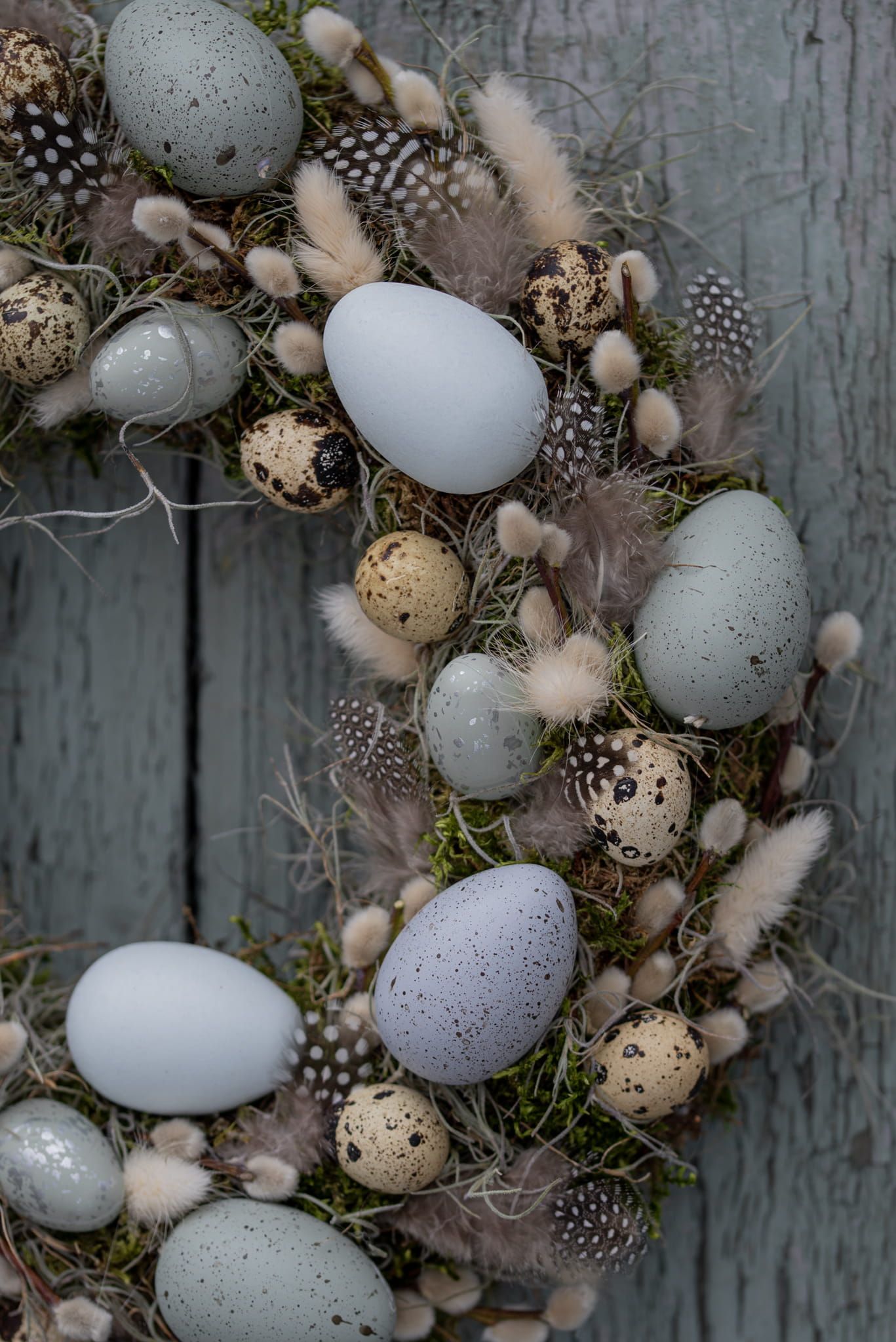 Wianek wielkanocny na mchu i tillandsii. Udekorowany wydmuszkami jaj w odcieniach koloru niebieskiego, gałązkami wierzby, piórkami, dmuszkiem oraz suszonymi kwiatami gliksji.