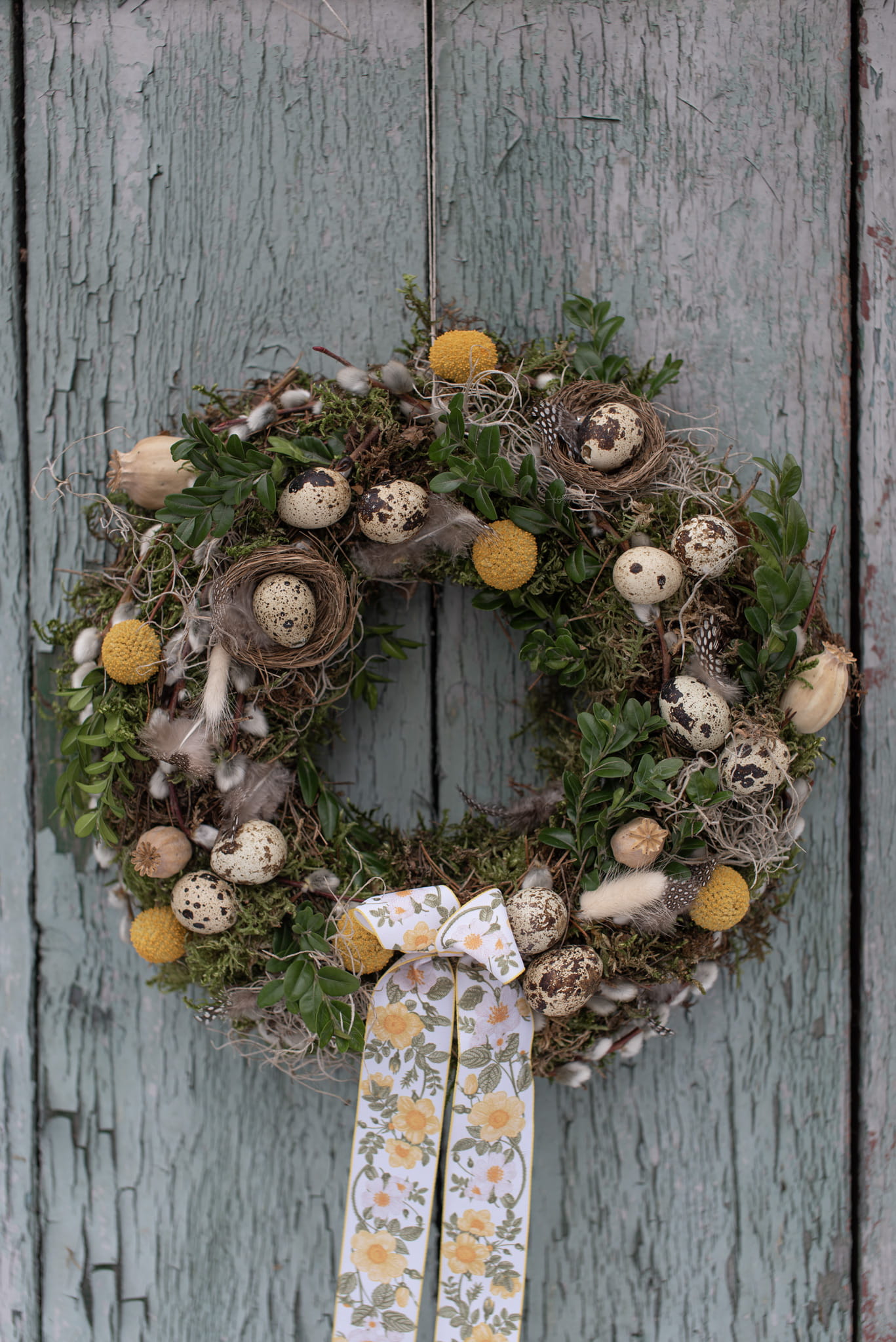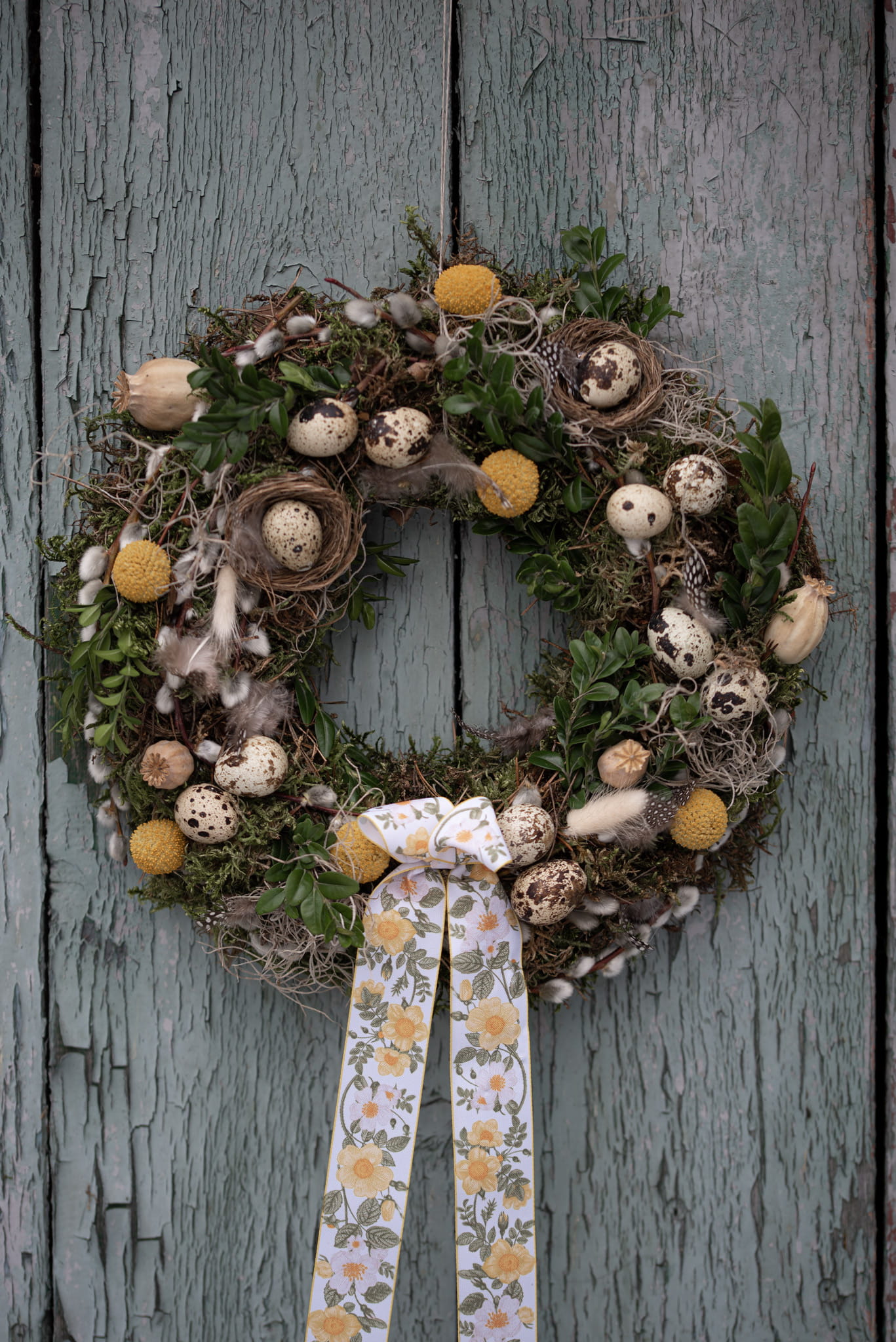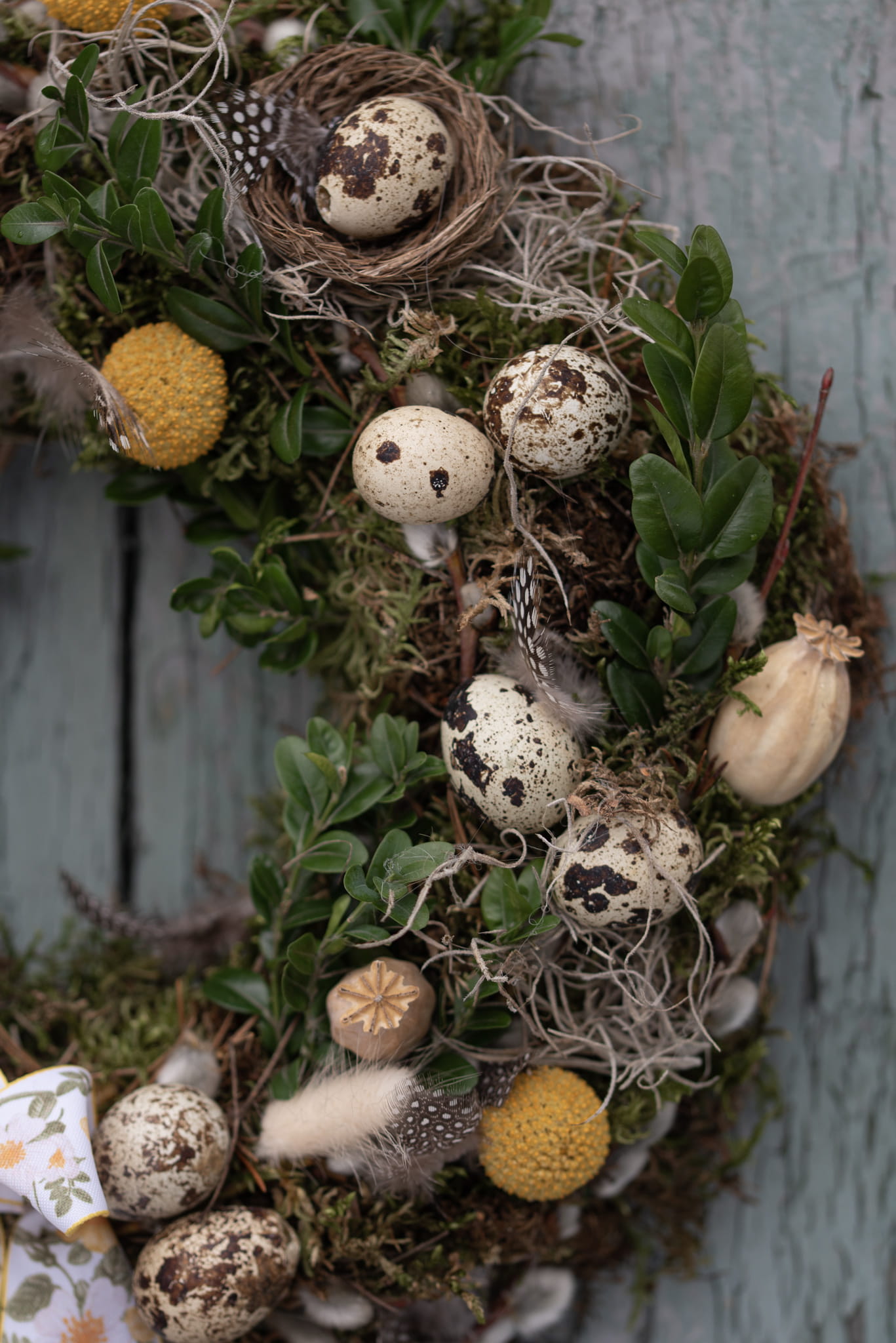 Wianek wielkanocny na mchu i tillandsii. Wypełniony gałązkami bukszpanu i wierzby. Udekorowany wydmuszkami przepiórczych jaj, kraspedią oraz dmuszkiem.